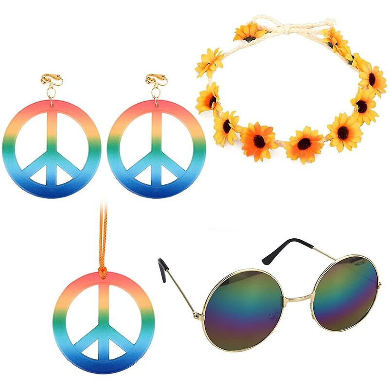 Confezione: ci sono 4 accessori nella confezione, tra cui collane colorate, fermagli per le orecchie colorati, occhiali colorati e una fascia hippie, con stile hippie, per creare un abito anni 60 per te < li>Collane e clip per le orecchie: le due forme sono segni di pace e i colori sono sfumature al neon, alla moda e più retrò < br> Gli orecchini sono progettati con clip per le orecchie, il che li rende più comodo da usare travestimento Occhiali da sole: l'obiettivo ha un design circolare e il design della superficie è in stile laser, quindi i cambiamenti di colore sono molto vario La struttura in metallo rende il tutto più armonioso e alla moda, e ha un migliore effetto decorativo Fascia Hippie: la fascia è decorata con una testa di girasole realizzato in poliestere e abbinato a una fascia intrecciata in colore naturale, che è molto fresca e t bello La lunghezza della fascia può essere regolata per soddisfare le esigenze di tutti Applica ione: la combinazione di questi quattro