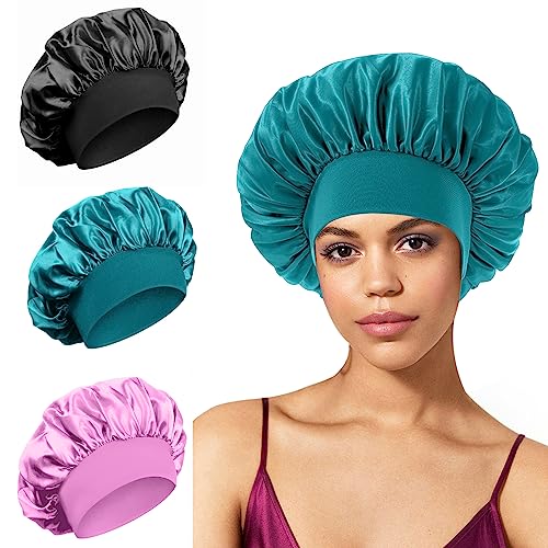 3 Pezzi Cuffia Seta Capelli Ricci, Cuffia Seta Capelli Ricci Cuffia da Bagno Cuffia Doccia Donna, Per la Doccia, il Sonno, il Trucco(Ciano+Nero+Rosa)
