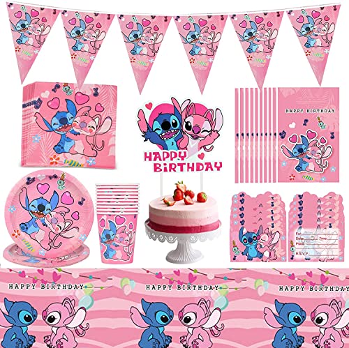 63 Pezzi Decorazioni Compleanno Lilo e Stitch, Kit Festa Compleanno, Piatti, Tazze, Banner Triangolare, Grande Decorazione Torta, Accessori per Feste di Compleanno per Ragazzi e Ragazze,10 Ospiti