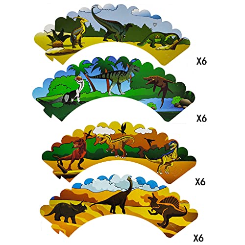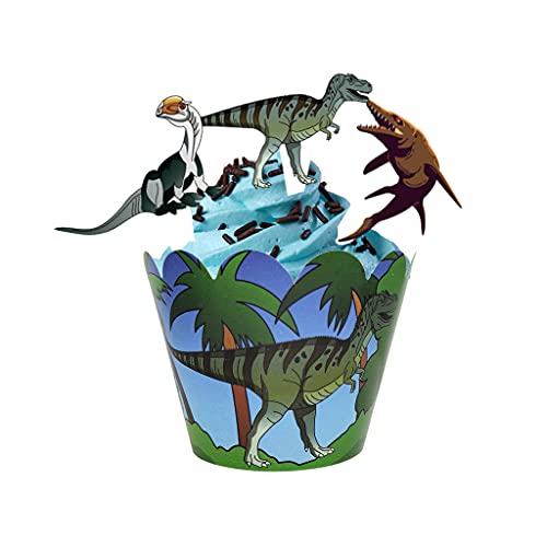 Contenuto della confezione: 24 topper per cupcake a forma di dinosauro + 24 involucri per cupcake a forma di dinosauro. I motivi realistici dei dinosauri includono tirannosauro, triceratopo, pterodattile, velociraptor, ecc.