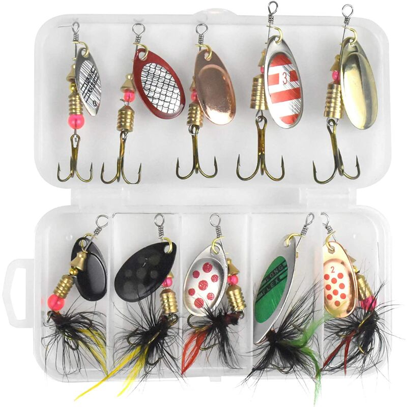 Materiali Premium - Le esche da pesca sono progettate con perno in acciaio inossidabile di alta qualità, paillettes rotanti e gancio affilato. Sono adatti a varie occasioni di pesca, come stagni, laghi, ruscelli, fiumi e grandi bacini artificiali. 【Misure multiple】 Ci sono 10 diverse dimensioni in una scatola. Gamma di taglie: 5,5-7 cm;