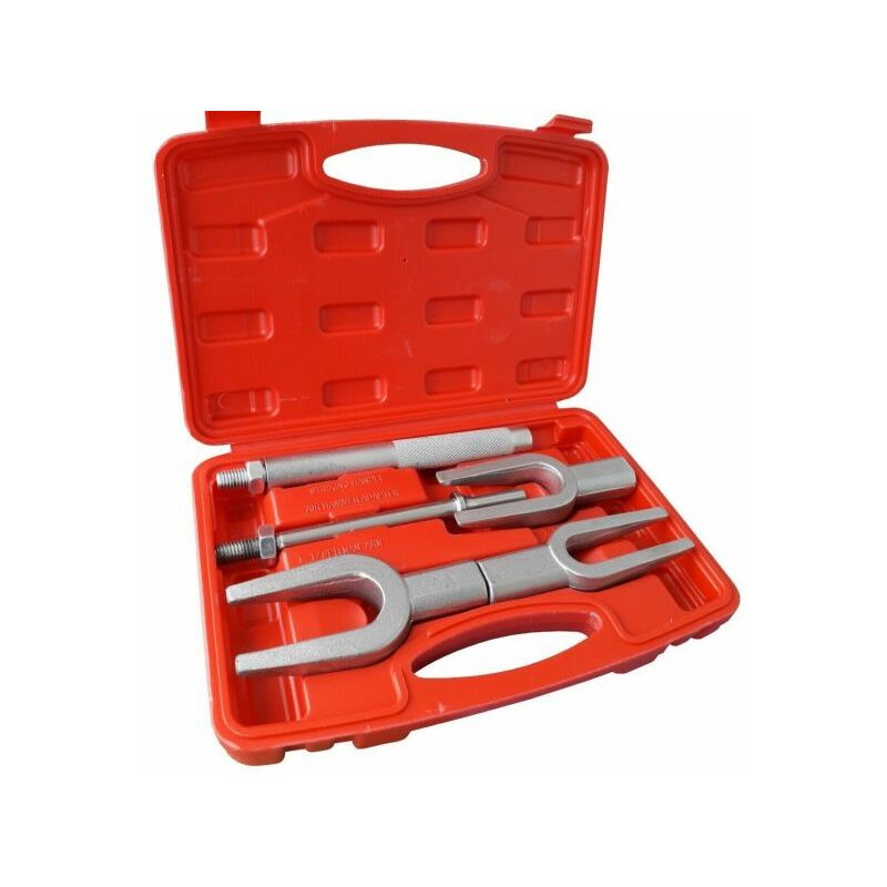 Kit 5 pezzi estrattore separatori a forca forche per giunti sferici e bielle Kit separatore/estrattore del giunto sferico realizzato sia per lavori manuali per battere il martello che per sistemi di aggancio al mertello ad aria compressa. Iideale per rimuovere tiranti, nodo sferico e bracci del pitman. Il kit separatore vi verrà recapitato completo di riduttori per martello pneumatico necessari per rimuovere e istallare i giunti sferici superiori e inferiori durante le operazioni di manutenzione della vostra auto. Attrezzo per veicolo: Volante, fulcro e attrezzi per sistema sospensione Apertura forcella: 28 mm, 24mm e 16mm. circa Maniglia forgiata, lunghezza: 200mm;