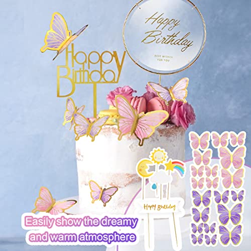 Materiale di alta qualità: decorazioni per torte con farfalla e arcobaleno realizzate in cartone glitterato di alta qualità, non si stropicciano facilmente, tutte sono tagliate con precisione, buona trasparenza, nessuna deformazione, sono attraverso una lavorazione speciale, sicure e riutilizzabili e belle per la decorazione di torte.