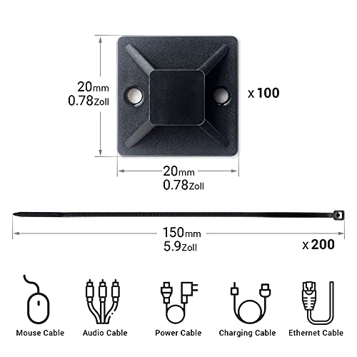 200 pezzi Fascette Stringicavo e 100 pezzi Base Autoadesiva,Set di Morsetti Stringicavo,Cable Management Fermacavi Adesivi (Nero)