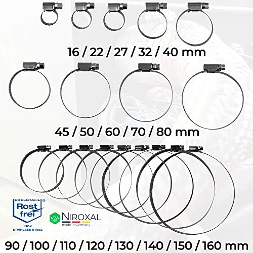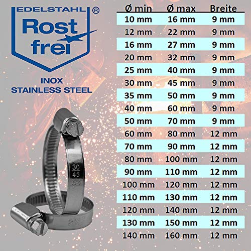 10 pezzi fascette stringitubo in acciaio inox con azionamento a vite senza fine W4 V2A campo di serraggio Ø 25-40mm = 2,5-4cm larghezza della striscia 9-mm DIN-3017 A2