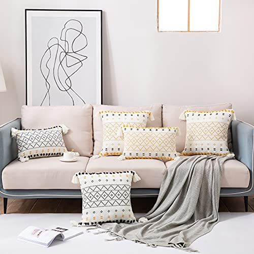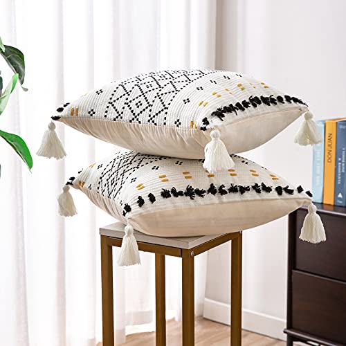2 Pezzi Federe per Cuscini Copricuscini in Cotone, Federa Decorativa Boho con Nappine e Cerniera Invisibile per Divano Soggiorno Camera da Letto 45 x 45 cm, Nero e Bianco