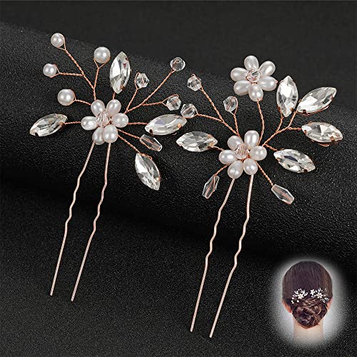 2 Pezzi fermagli per capelli da sposa, argento e cristalli con perle, Forcine Capelli Strass Cristallo Fermagli per Capelli Sposa,accessori per capelli per donne e ragazze(oro rosa)