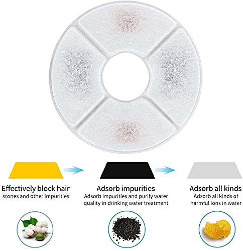 Raccomandazioni: Per evitare che il carbone attivo diventi acqua, immergere il filtro in acqua per 5 minuti e sciacquarlo accuratamente sotto l'acqua corrente prima dell'uso. A seconda della frequenza con cui beve il tuo animale domestico e del numero di animali che utilizzano la fontana, cambia il filtro ogni 2-4 settimane.
