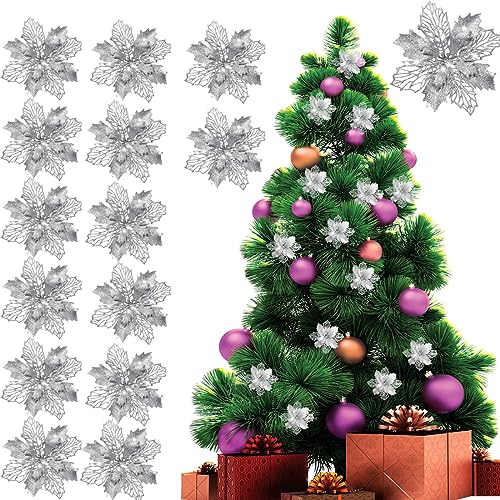15 Pezzi Fiori Finti Glitter Ornamenti di Natalizi, Fiori di Natale Poinsettia, Fiori per Albero di Natale Artificiali, Glitter Poinsettia, Fiori Ornamento, per Alberi di Natale Ghirlande, Argento