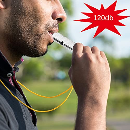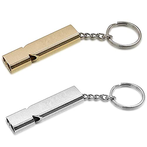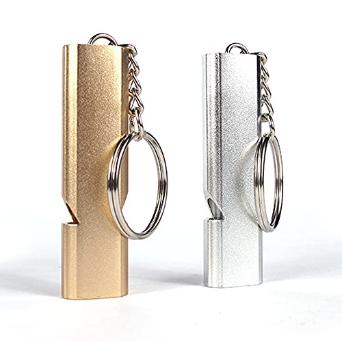 【Il pacchetto include】 2,2 pollici * 0,6 pollici, dorato e argento. 2 x fischietti con portachiavi. Suono più forte, i doppi tubi possono raggiungere i 120 decibel, possono essere ascoltati da persone lontane.