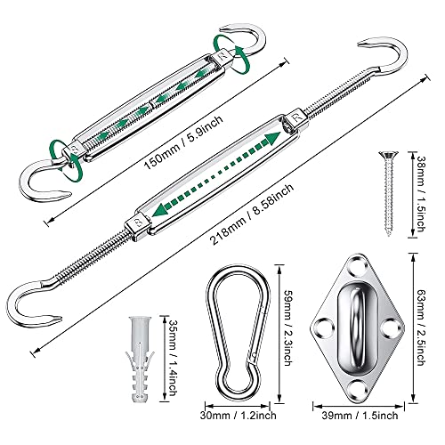 ✿ BLOCCO DI TENSIONE REGOLABILE: Tenditore regolabile per creare una tensione ideale per stringere o allentare la vela ombreggiante. Insegna allo schermo magnificamente e senza i temuti annunci. Progettato per durabilità e affidabilità per mantenere l'ombra stabile al vento e al sole.