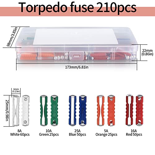 Il pacchetto include: riceverai 210 pezzi di kit fusibili siluro in totale, corrente: 5A, 8A, 10A, 16A, 25A, 5 valvole diverse per soddisfare esigenze diverse.