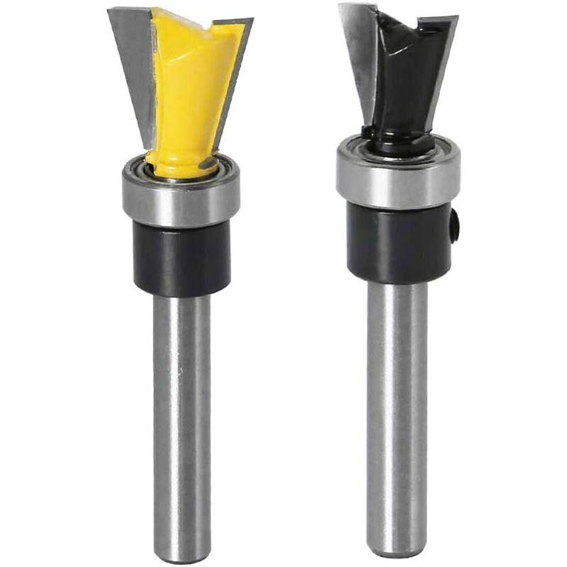 Punte a coda di rondine, due scanalature, gambo da 6,35 mm (1/4) con guida del cuscinetto montata sul gambo. Punta del router nera - Angolo di taglio: 10°;