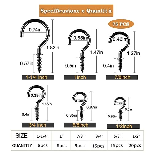 75 Pezzi Ganci a Vite 6 Taglie, Ganci da Soffitto in Metallo, ganci da muro per legno, gancio lampadario, per Appendere Vasi di Fiori, Lanterne, Tazza da tè, Decorazioni Natalizie, Campanelli a Vento