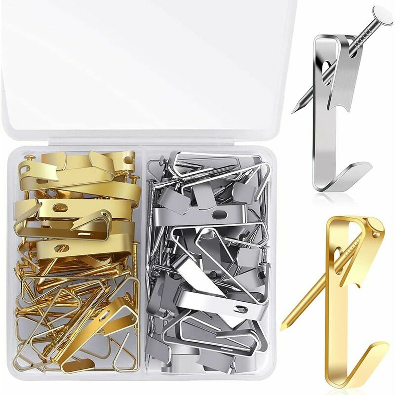 Gancio per foto in acciaio inossidabile: riceverai 20 ganci da parete dorati e 20 ganci d'argento in una borsa e 40 chiodi, tutti conservati in una comoda custodia, sufficiente per il tuo uso quotidiano. Facile da installare: basta attaccarlo al muro con un martello. Il design a cupola superiore protegge le dita dagli urti durante l'installazione. Grazie ai nostri piccoli chiodi, i ganci possono essere rimossi con cura con piccoli segni e danni sul muro, puoi riciclarli per molte volte, risparmiando più costi. Materiale premium: i ganci per appendere quadri sono realizzati in alta acciaio inossidabile di qualità, robusto, resistente all'usura, durevole e leggero. Il peso del carico è di 13,6 kg, che può sopportare una varietà di oggetti a casa, in ufficio o a scuola. Puoi usarli con sicurezza. Piccolo danno al muro: quando si rimuove l'unghia, solo un piccolo il foro stenopeico rimarrà sul muro, il che non danneggerà il muro. Adatto per legno o cartongesso. NOTA: non adatto a pareti