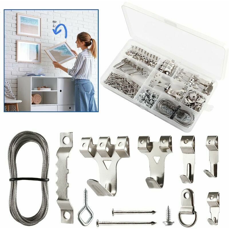Acciaio inossidabile - I ganci per lavagna argento sono realizzati in acciaio inossidabile di alta qualità, resistente e non facilmente deformabile. Possono supportare un carico fino a 75 libbre 【250 unità in 1 confezione】Con 60 ganci e 190 altri accessori in questa confezione. La confezione include 25 ganci in acciaio da 10 libbre, 15 ganci in acciaio da 20 libbre, 10 ganci in acciaio da 30 libbre, 6 ganci in acciaio da 40 libbre, 4 ganci in acciaio da 75 libbre, 30 chiodi corti, 69 chiodi lunghi, 40 viti, 20 anelli viti, 20 anelli a D, 10 dorsi a dente di sega e 3 m di filo d'acciaio, tutti conservati in una pratica custodia 【Versatile】 Questa sospensione per quadri hardware è composta da 11 diversi tipi di componenti, puoi sicuramente trovare quello che ti serve. Possono essere usati per appendere quadri, decorazioni, dipinti, orologi, luci, utensili da cucina o persino vestiti. Puoi usare un trapano per fare un primo foro se hai difficoltà a piantare il chiodo nel muro. Non