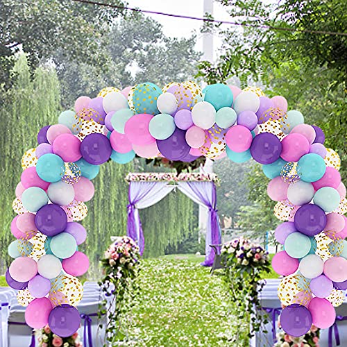 [Valore]: 15 palloncini coriandoli glitter dorati da 12 pollici, 15 palloncini viola/blu/rosa da 12 pollici, 60 palloncini viola/rosa/blu da 10 pollici e 80 palloncini in lattice viola/blu/rosa/bianco da 5 pollici, 1 strumento per annodare, 1 nastro d'argento, 1 catena per palloncini, (100) punti di colla per palloncini.