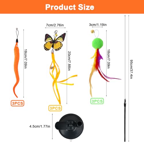 【Giochi per Gatti Interattivi】include 1 pezzo di ventosa, 1 pezzo di bastone per gatti e 9 pezzi di giocattoli con campana (alcuni accessori sono di colore casuale), 11 pezzi in totale. È possibile cambiare facilmente i giocattoli sul bastone per gatti per far divertire di più il vostro gatto!