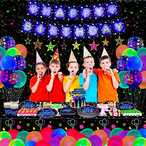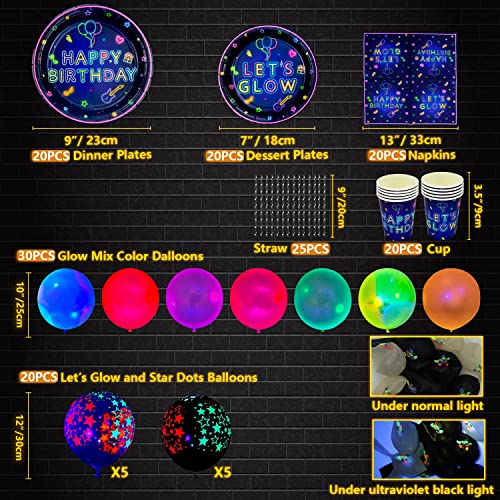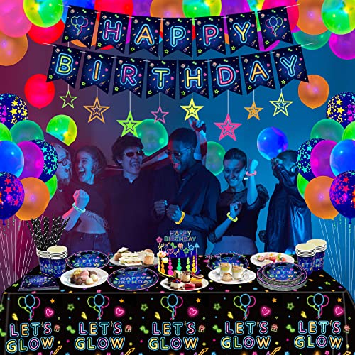Set di 170 pezzi Let's Glow Neon Party Supplies Glow Party Tableware Set di palloncini al neon Glow in the Dark Banner di compleanno appeso stelle per Blacklight Party Decoration Serve 20 pezzi