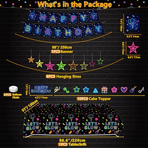 Design accattivante al neon: questi articoli per feste al neon presentano un motivo di luce al neon ed elementi colorati graffiti su uno sfondo viola scuro, adatti per decorazioni per feste a tema bagliore. Palloncini, striscioni, stelle appese, decorazioni per torte si illuminano sotto una specifica luce ultravioletta viola. Il design colorato con stelle al neon e anelli luminosi sullo sfondo nero renderà la tua festa di compleanno colori vivaci e vivaci. Ma gli articoli da tavola per uso alimentare non si illuminano al buio o sotto la luce nera.
