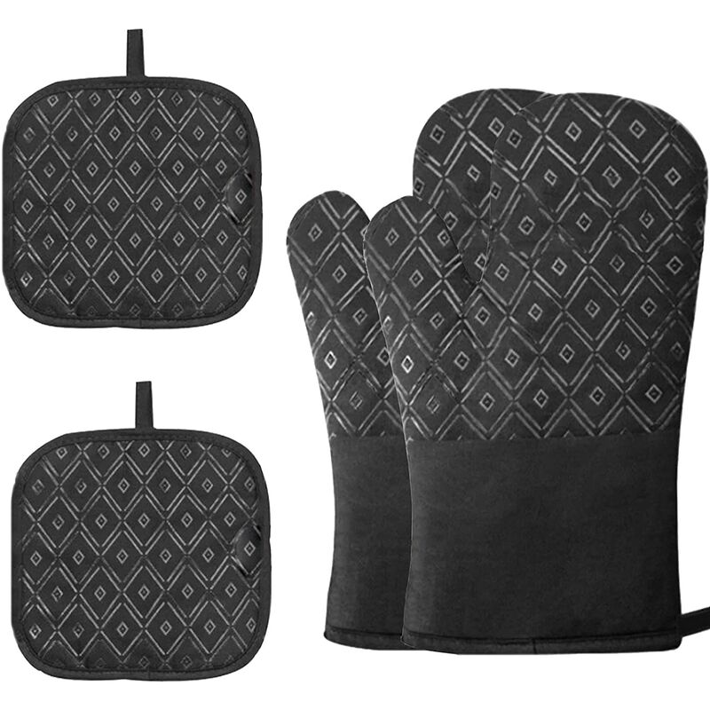 Materiale: guanti da forno in silicone e cotone ad alta resistenza al calore che proteggono meglio le mani rispetto a guanti in silicone simili. Antiscivolo e traspirante: la superficie del guanto è in gel di silice, che può migliorare la resistenza allo scivolamento durante la manipolazione delle pentole. La morbida fodera in cotone assicura un comfort confortevole e traspirante e protegge la pelle. Resistenza alle alte temperature: rallenta l'aumento della temperatura quando si maneggiano oggetti caldi. Sia che tu stia rimuovendo le teglie dal forno o la pentola dal fuoco, puoi essere sicuro che le tue mani sono protette. Design da appendere: i guanti e i tappetini da forno sono dotati di cordini che possono essere facilmente riposti e appeso al passante quando non in uso. Ciò consente di risparmiare spazio e rende la cucina più pulita. Utilizzo: Utilizzato specialmente in forni a microonde, forni, cottura al forno, grigliate, teglie, cucine speciali. Per proteggere mani e