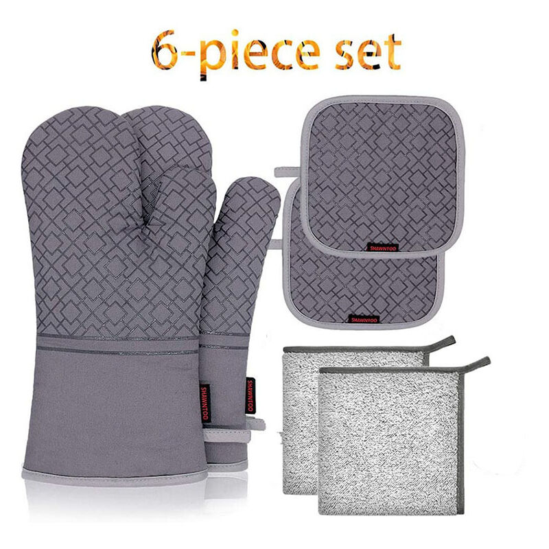 6 pezzi di grande valore - -- 6 guanti da forno e presine di grande valore, inclusi 2 guanti da forno (7X13 pollici), 2 presine (7X7 pollici) e 2 asciugamani da cucina (11.8x11.8 pollici), max. Adatto per servire pentole calde, padelle, piatti, ciotole, vassoi, ecc. 【Tecnologia resistente al calore a 500°F】 - Guanti da forno lunghi e spessi da 13, resistenti al calore fino a 260°/500°F C, protegge efficacemente le mani dalle ustioni. È il regalo perfetto per il Ringraziamento/Natale, la scelta migliore per donne, uomini, fornai, amanti della cucina. 【Materiale in morbido cotone trapuntato】--Il guanto da forno non è solo una comoda e morbida fodera in cotone trapuntato, ma adatto anche per utenti destri o mancini. I guanti da cucina sono lavabili in lavatrice e asciugabili in asciugatrice e molto facili da pulire e conservare. 【Design comodo e antiscivolo】 -- Guanti da forno e presine resistenti sono progettati con una superficie in silicone antiscivolo per fornire un presa più salda e