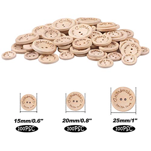 300 Pezzi Handmade with Love Bottone in legno - 15mm 20mm 25mm Bottoni in legno con forma tonda per decorazioni di cucito e lavorazione
