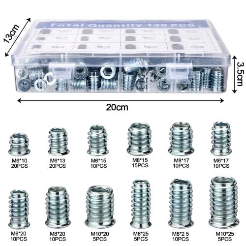 130 Pezzi Inserti Filettati, M6 M8 M10 Boccole Filettate per Legno, Vite Dado Esagonale in Acciaio Zincato, Inserto Filettato per Mobili in Legno