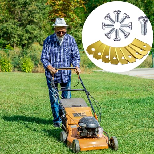 Riceverai 9 lame per tosaerba dorate, incluse 9 viti, la dimensione è 35 * 18 * 0,75 mm.