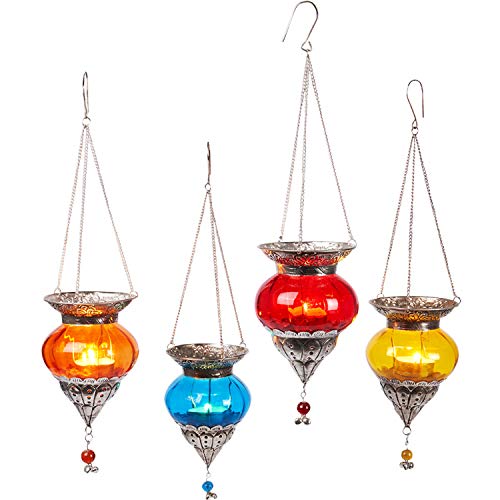 Set di 4 pezzi Lanterna in vetro orientale da appendere Bara colorato da 15 cm | Portalume orientale in vetro con maniglia in stile orientale | Lanterne marocchine da appendere come luci sospese