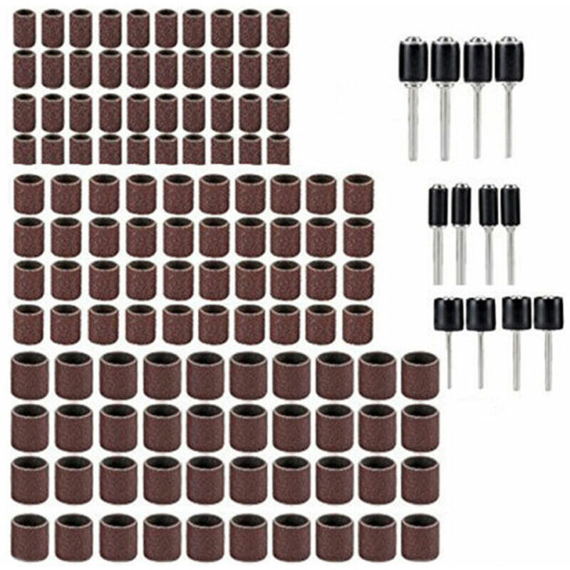 Il kit per tamburi e manicotti di levigatura include 120 pezzi manicotti abrasivi e 12 pezzi di brividi per rimuovere ruggine, levigatura del legno, lucidatura dei metalli, ecc. Caratteristiche: Kit Tamburo 120 pz: 120 pz 80 manicotti di levigatura a grani per il broy elettrico, di cui 3 taglie da 1/2 pollice, 3/8 pollici, 1/4 pollici, 40 pz ciascuna. Supporto per batteria in sabbia incluso: asta da 3,175mm per dremel o d & #39;