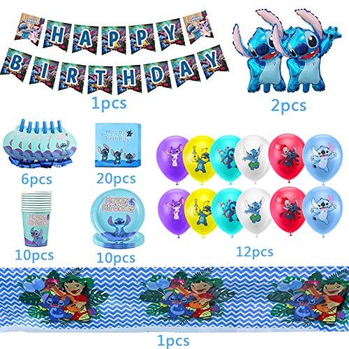 62 Pezzi Lilo Stitch Party Supplies Set, Set Stoviglie per Feste, Kit Festa Compleanno,Tovaglia, Tovagliolo, Palloncino in lattice, Accessori per Feste di Compleanno per Ragazzi e Ragazze, 10 Ospiti