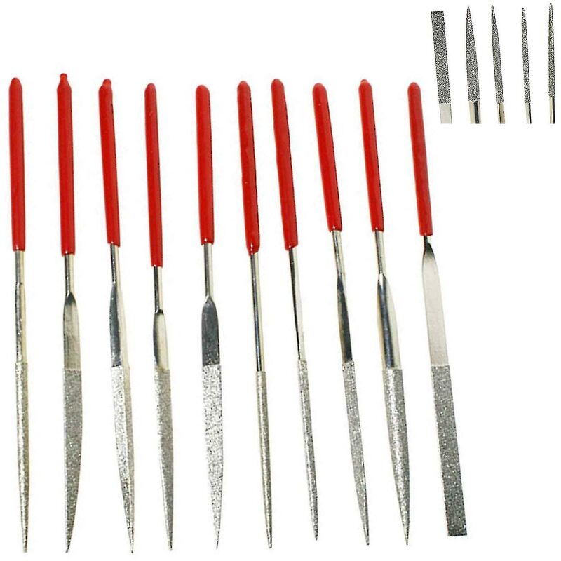 uguale a piatto, quadrato, fermaglio, taglierino, incrocio, tondo, ovale, semitondo, triangolo e file di protezione. Copre una gamma completa di sagomatura, formatura, intaglio, incisione e rimozione di materiale Sono progettati per tagliare rapidamente e senza intoppi Lunghezza: 14 cm, spessore: 3 mm Varietà di forme Colore: manico rosso, corpo argento
