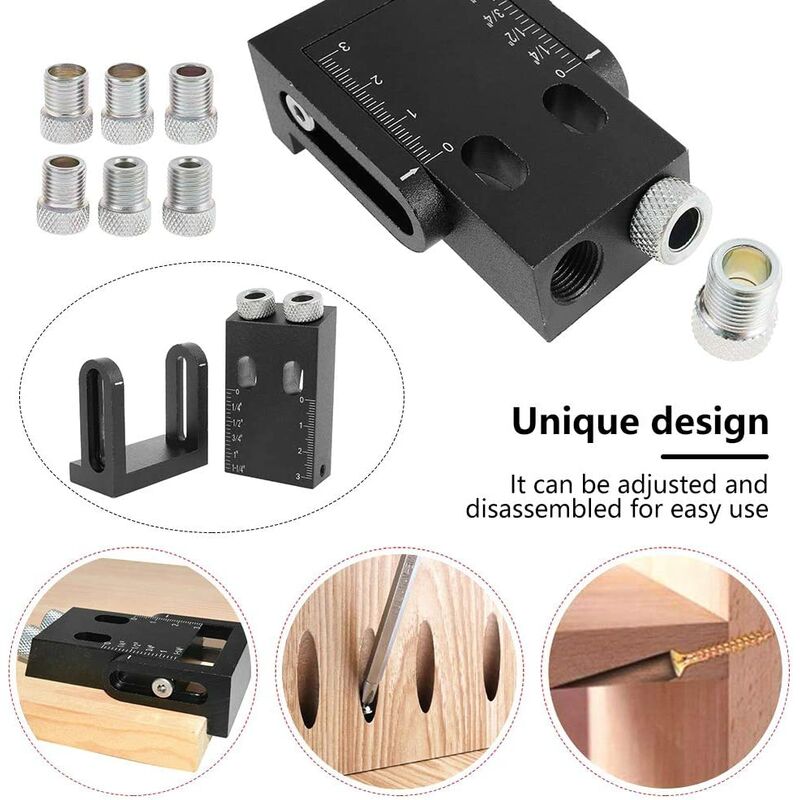 manica: 6, 8, 10 mm. 【Localizzatore di fori obliqui a 15 gradi】 Il localizzatore di fori obliqui a 15 gradi, che rende più solida la connessione tra le due piastre, ti aiuta a praticare fori. Fori obliqui facilmente e individuare con precisione. 【Design unico】È regolabile e facile da usare. È possibile regolare la distanza del punzone corrispondente in base alle proprie esigenze. Il punzonatore è uno strumento indispensabile per la lavorazione del legno domestica