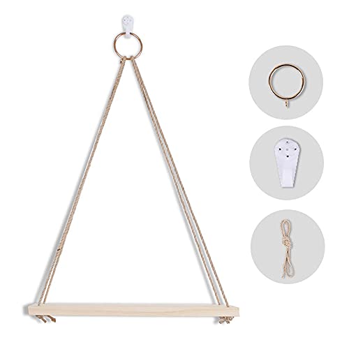 2 Pezzi Mensola in Legno con Corda di Corda da Appendere, Mensola Sospesa in Legno con Corda, Mensole Sospese in Corda Altalena Decorazioni, con 2 Anello e 2 Gancio in Metallo, Decorazione della Casa