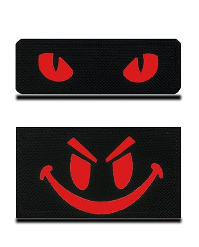 2 pezzi nero rosso riflettente, viso sorridente e occhi di gatto, toppa divertente ricamata con applicazioni in velcro per vestiti, borse, zaino, uniforme, gilet per cani, casco militare tattico