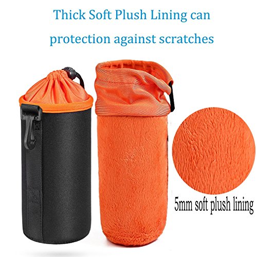 Funzioni e portabilità: impermeabile DSLR Camera Bag Lens realizzata in neoprene resistente PU protegge da umidità, sabbia, polvere e urti accidentali o graffi, adatto a shutterbugs che amano viaggiare. Gancio permette di collegare l' obiettivo sacchetto ovunque con un anello (come borse e zaini fotocamera)