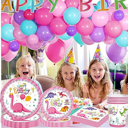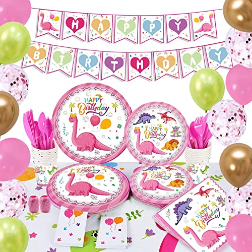 86 Pezzi 16 Ospiti Kit Dinosauri,Feste di Dinosauri Decorazione Compleanno per Bambini,Banner Compleanno-Palloncini-Piatti Tazze Tovaglioli Posate Borsa Tovaglia Stoviglie Utensili(rose)