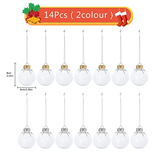 La confezione include: 14 bellissime palline decorative artigianali trasparenti, molto adatte per decorazioni natalizie e piccoli regali, con coperchio in metallo staccabile, due colori oro e argento, diametro 6 cm.