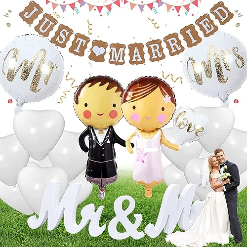 【Abito romantico】 Il pacchetto include 113 decorazioni per la festa di nozze, 1 palloncino in alluminio Mr., 1 palloncino in alluminio Mrs., 1 palloncino in alluminio Love, 3 palloncini bianchi, 3 palloncini dorati, 100 palloncini bianchi palloncini a forma di cuore, 1 x striscioni nuziali dritti 1 x lettera Mr&Mrs in legno Il kit di decorazione per palloncini nuziali può soddisfare le tue esigenze di decorazione e creare un matrimonio romantico!