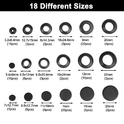 ✅【Pacchetto Incluso】Riceverai 125 pcs passacavi in gomma, incluse 18 diverse dimensioni, 6,4 mm x 15 pcs, 7 mm x 20 pcs, 8 mm x 10 pcs, 9 mm x 20 pcs, 12 mm x 10 pcs, 9,5 x 12 mm x 6 pcs, 7 x 12,7 mm x 7 pcs, 9,5 x 12,7 mm x 5 pcs, 16 mm x 5 pcs, 19 mm x 4 pcs. pz, 20 mm x 4 pcs, 14,3 mm x 3 pcs, 15 mm x 3 pcs, 20,6 mm x 3 pcs, 22 mm x 3 pcs, 24 mm x 2 pcs, 24,6 mm x 3 pcs, 25 mm x 2 pcs. Confezionato in una scatola di plastica per una facile conservazione.