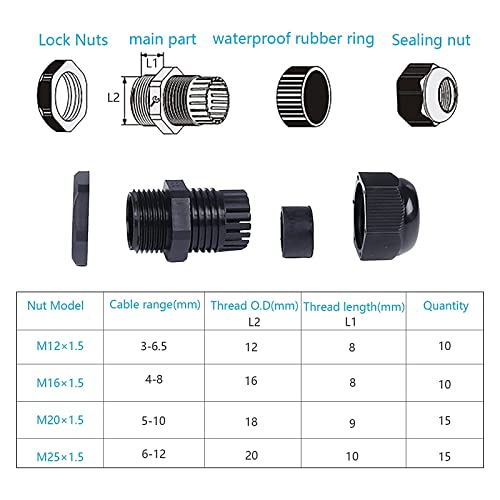 50 Pezzi Passacavo Impermeabile Regolabile in Plastica Nero, Kit di Pressacavi M12-M25 PG7-PG19- Facilmente installabile per proteggere i cavi.