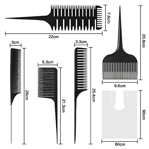 【5 Pezzi Pettine Per Meches Set】 Ci sono 5 diversi pettine per meches nel pacchetto di pettine capelli e 2 mantelle, vale a dire 1 pettine per meches, 1 pettine a coda, 1 pettine per meches, 1 pettine balayage e 1 pettine intrecciato con manico in acciaio inossidabile. Il comb ha un passo dei denti diverso su ciascun lato, una quantità sufficiente e uno stile ricco per soddisfare le tue esigenze di acconciatura, inoltre può essere condiviso con la famiglia e gli amici.