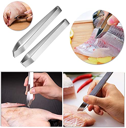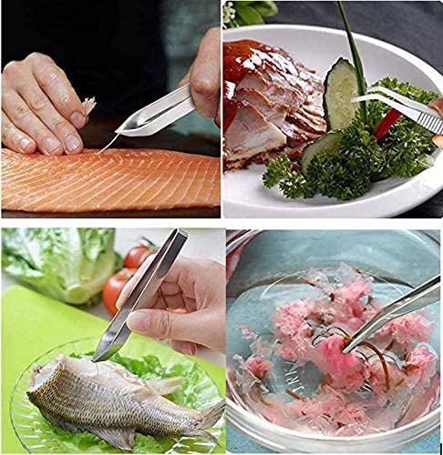 Pinze professionali:Il design delle pinze a naso piatto e le pinze inclinate lo avvicinano alla superficie dell'oggetto,consentendo di rimuovere rapidamente lische di pesce,peli di maiale e piume di pollo,consentendo di cucinare più facilmente.