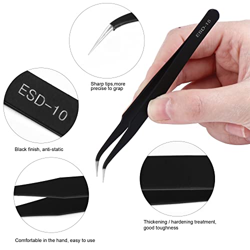 Qualità eccellente: il set di pinzette di precisione è realizzato in resistente acciaio inossidabile con vernice antistatica non magnetica sulla superficie, resistente alla maggior parte degli acidi e ad altre sostanze corrosive. Il trattamento termico e la tempra rendono le pinzette altamente elastiche.