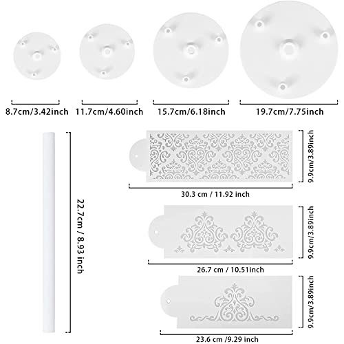 Quantità della confezione: 23 pezzi in totale, inclusi 15 pioli per torte a piani e 5 divisorio per torte (4 diverse dimensioni, circa 9 cm, 12 cm, 16 cm, 20 cm, possono realizzare torte da 10 cm, 15 cm, 20 cm, 25 cm o 30 cm), 3 Modello per goffratura di torte.
