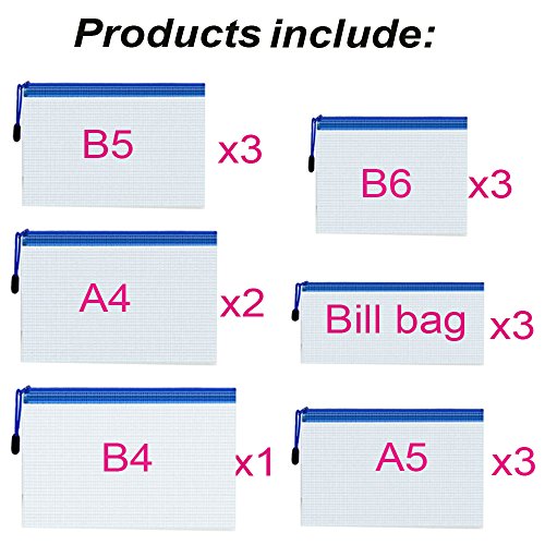Ogni file size-zip borsa ha 6 misure: 38,6 x 27,9 cm (B 4), 33 x 23,6 cm (a 4), 29 x 21,1 cm (B 5), 23,6 x 17,5 cm (a 5), 19,3 x 14,2 cm (B 6), 23,6 x 11,2 cm (bill), piccolo pacchetto può memorizzare il vostro cancelleria, grande pacchetto può contenere trucco cosmetici o accessori da viaggio.