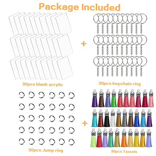 Confezione e dimensioni: confezione con 30 pezzi di portachiavi in acrilico rettangolari, 30 pezzi di portachiavi e 30 pezzi di nappe portachiavi multicolori, 90 pezzi in totale, dimensioni acriliche 7 cm di lunghezza x 3 cm di larghezza x 0,11 cm di spessore (2,75 x 1,18 x 0,08 pollici).