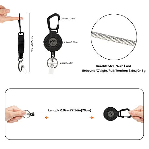 ^_^ Ritrazione a fune ultraresistente ✔️ La corda telescopica è realizzata in filo d'acciaio antiossidante, resistente, non facile da rompere e non arrugginisce. Non ci si deve preoccupare che la corda d'acciaio si rompa. Tiro della corda fluido e silenzioso, Una volta estratta la corda, un meccanismo di riavvolgimento extra potente assicura che l'anello portachiavi venga ritratto in modo rapido e affidabile. Peso/tiro del rinculo: 8,6 oz/245 g.