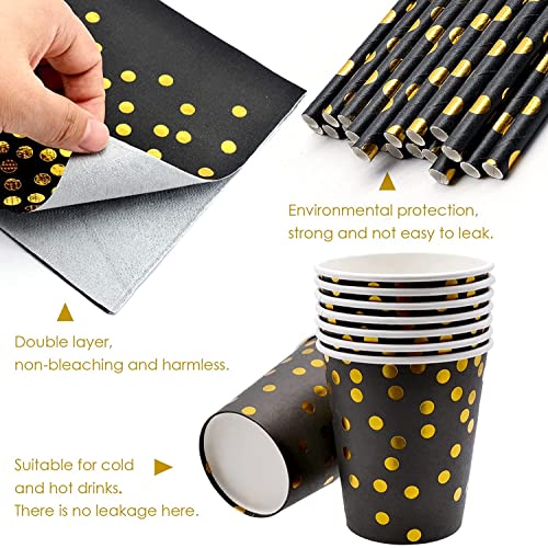 96 Pezzi Posate per Feste, Riutilizzabili Piatti Carta Natalizi-Set, Includere Piatti, Tazza, Fazzoletto di Carta, Cannuccia, per L'anniversario, Matrimonio, Compleanno (Oro Nero)